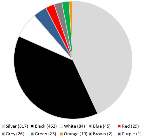 In total, 74 individual colours were used on the 1199 cars manufactured: 29 colours can be found only on a single car. The ten most popular colours were AML Carbon Black (260), Quantum Silver (146), Hammerhead Silver (138), Onyx Black (102), Meteorite Silver (99), Tungsten Silver (68), Lightning Silver (49), Morning Frost White (47), Storm Black (47) and Stratus White (36). When grouped together, Silver, which includes many metallic greys is the most common hue followed by black and then white.