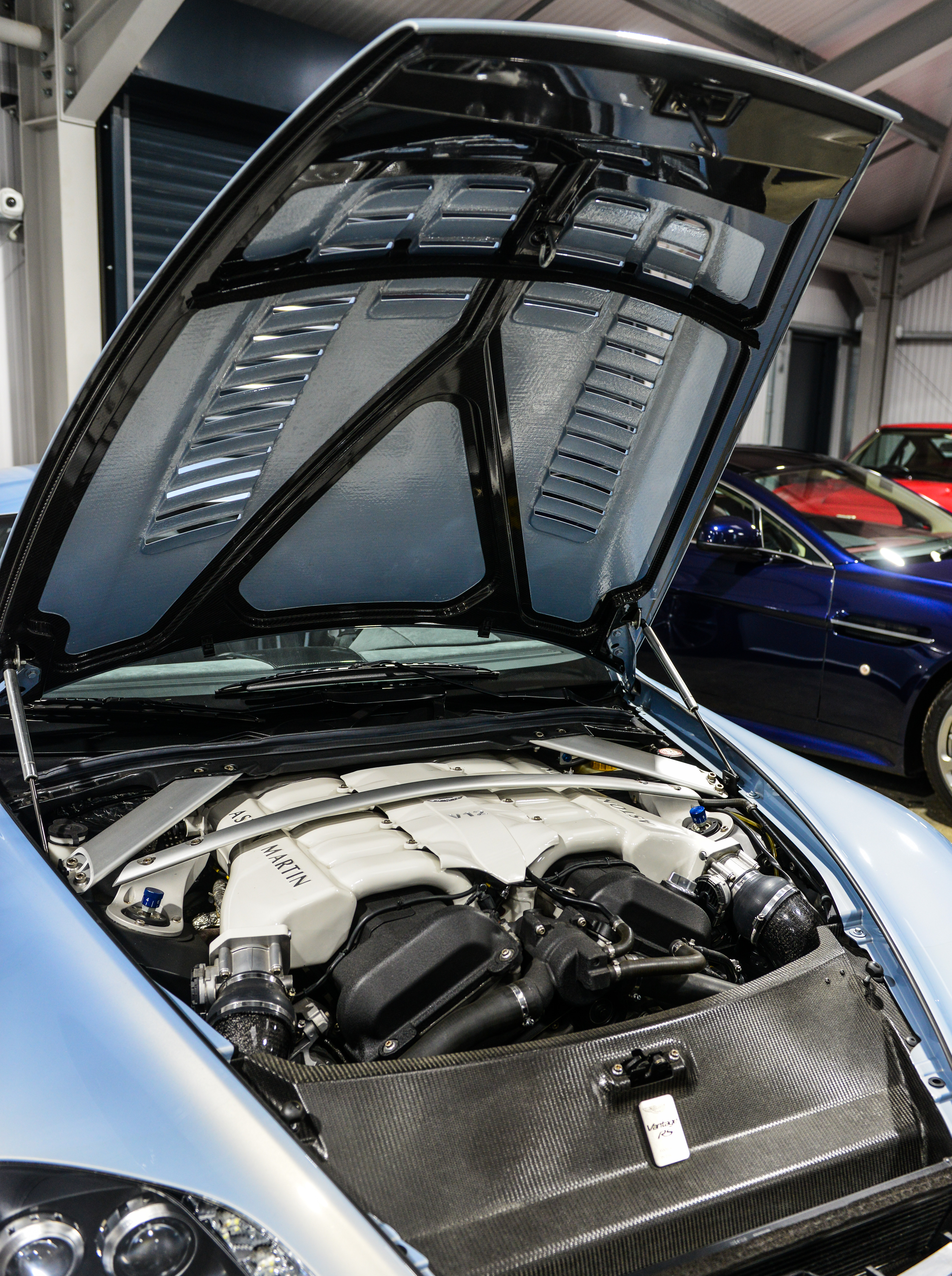 The AM10 engine was almost identical to the AM08 from the DBS coupe (VH3) with only three changes having been made to the engine components in order for it to fit within the VH2 structure. The design of the wet sump was re-profiled losing 15mm depth as the VH2 front structure was originally designed for the dry sump V8. The oil filter mounting and water pump housing were also revised to suit the smaller engine bay. Finally, the AM10 engine and transmission oil systems were heavily modified including a rear-mounted oil cooler with a much increased capacity, sensible in a car that generates such a lot of heat in a confined space.