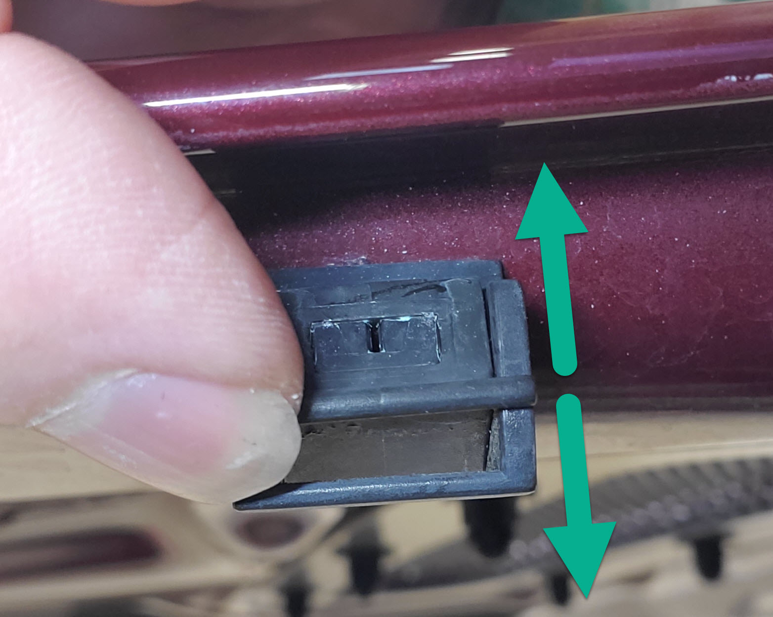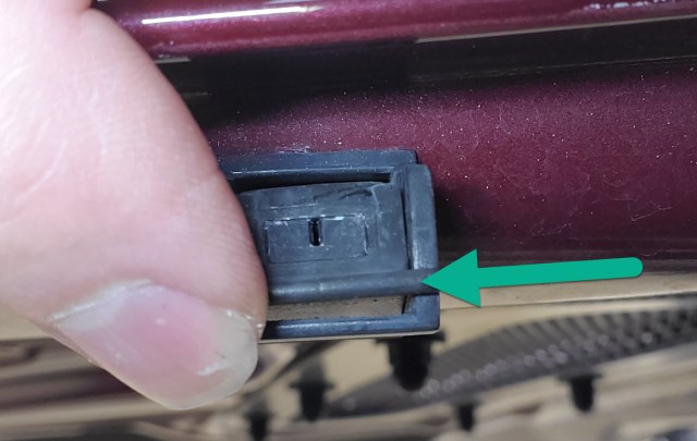 • Locate the two Washer Jets on the under side of the rear edge of the hood (bonnet).  They are tucked under just an inch or so to make them less visible.   You can always find them by giving the washer stalk a push and just watch for where the jet originates from.