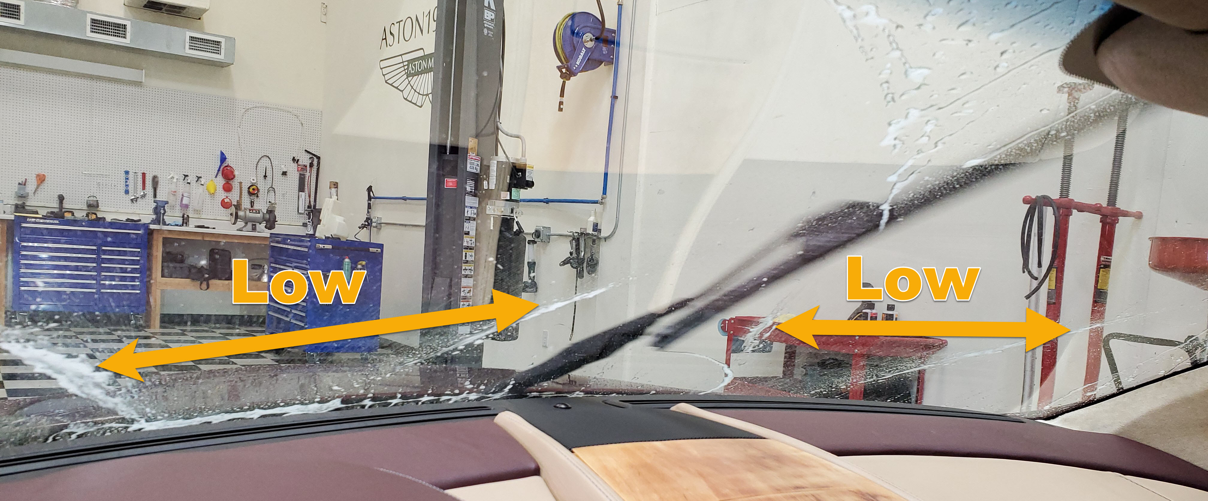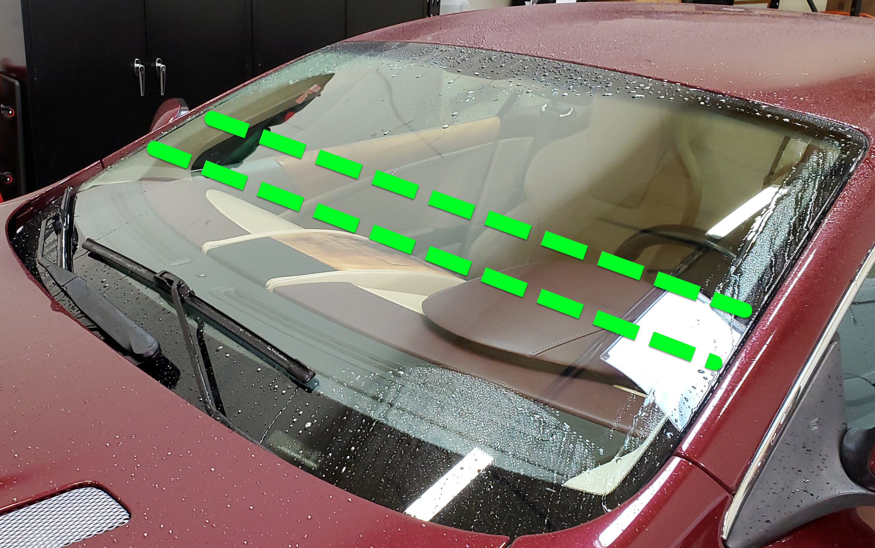 • The DB9 windshield is huge, and laid back on a steep angle.   Outside the car I found my ideal spot just below 1/2 way up and put a mark.