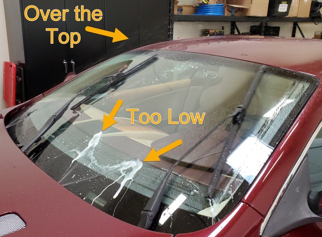 • Inside the car I was surprised because the mark seemed further down than I expected.   Optical illusion a bit.   Helpful to have the mark then since I will be in the car testing each spray realignment.
