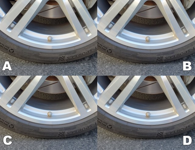 If you guessed C you’re right, but it was nothing more than a good guess. They were 48 psi (A), 33 (B), 38 (C) and 28 (D). You had no way of knowing by just looking at it. The visual difference is so minor you would never spot it walking towards your car distracted by its ravishing good looks.