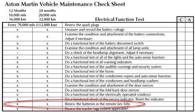 It surprised me that Aston Martin does in fact recommend that the key fob batteries be replaced at every annual service.  I replaced my Volvo fob batteries 9 years ago and they are still working.  This standard makes no allowance for use or condition, just an automatic replace.   Probably too conservative for me, and I bet they charge $35 or something to change each one.  Here is an excerpt of their vehicle maintenance check sheet.
