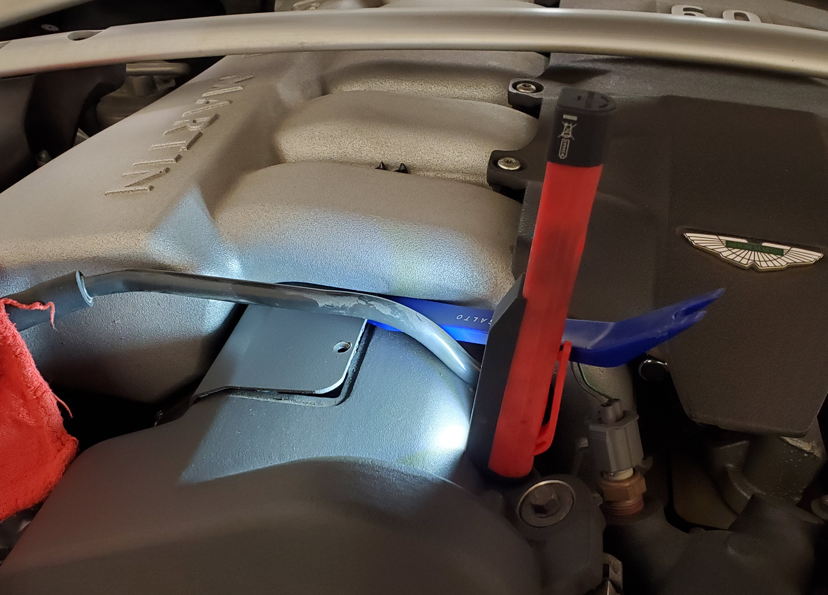 A common issue with the V12 Aston Martin engine is that the coil packs begin to fail causing a misfire. When ordering replacements you need to know if they are the early 2-pin or later 3-pin versions. The problem is that you can’t know for sure before you start. Aston Martin made the design change on the DB9 probably sometime in 2006. Even the dealer can’t tell you if you supply your VIN number. To know for sure you need to get a look at them. Problem is, they are deep in the middle of the cylinder head. Let me show you a trick to get a peek before you start the project.