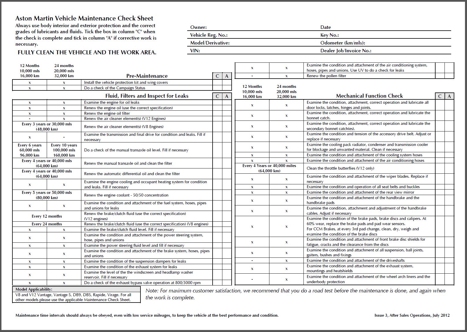 I have reviewed the Owners Manual and the Dealer checklist and created this list of the service steps below. They state the Dealer Checklist is for “V8 and V12 Vantage, Vantage S, DB9, DBS, Rapide, Virage.” My list below is tailored just for the V12 cars, and of course my articles and videos are showing the work done on my own 2005 DB9 Coupe – methods on the other models might vary.