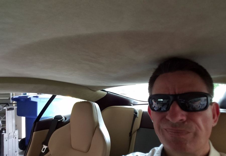 It all started on hot sunny California summer day when I got into my DB9 after work. Open the beautiful swan wing door, slide butt into supple sculpted leather seat, and then WTF?! Why is there fabric on my head? As you can see in my happy owner photo here my headliner sagged and was draping across my head. Crap – something else to fix and I am not an upholsterer.